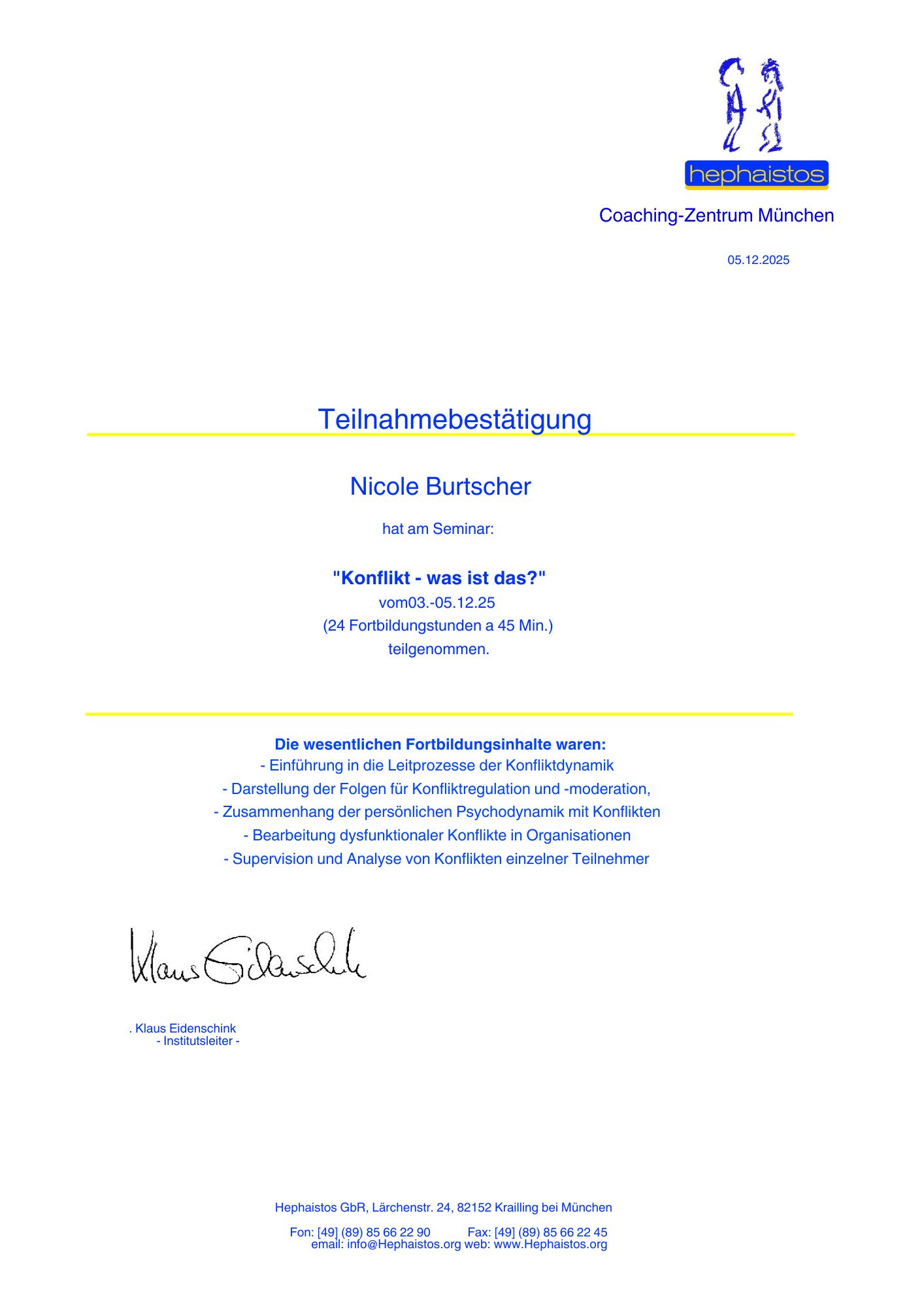 Diese Ausbildung vermittelt, wie Konflikte entstehen, warum sie oft eskalieren und warum sie manchmal nötig sind, um Veränderungen möglich zu machen. Im Mittelpunkt steht der praktische Umgang mit Konflikten: Sie zeigt, wie man erkennt, wann Konflikte schaden und wie sie konstruktiv genutzt werden können. Ziel ist es, Konflikte nicht zu vermeiden, sondern sie bewusst und lösungsorientiert zu gestalten – im persönlichen Alltag wie auch im beruflichen Umfeld.